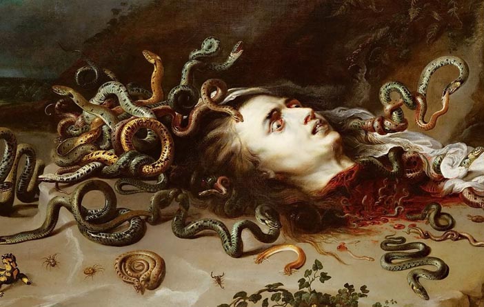 Em tese, apenas Medusa é Górgona. As duas outras, Ésteno e Euríale, somente lato sensu é que podem ser assim denominadas. Das três só Medusa era mortal. Habitava, como suas irmãs, o extremo Ocidente, junto ao país das Hespérides. Estes monstros tinham a cabeça enrolada de serpentes, presas pontiagudas como as do javali, mãos de bronze e asas de ouro, que lhes permitiam voar. Seus olhos eram flamejantes e o olhar tão penetrante, que transformava em pedra quem as fixasse. Eram espantosas e temidas não só pelos homens, mas também pelos deuses. Apenas Posídon ousou aproximar-se delas e ainda engravidou Medusa. Foi então que Perseu partiu do Ocidente para matar a Górgona, o que fez utilizando determinados objetos mágicos e sobretudo seu escudo polido de bronze.